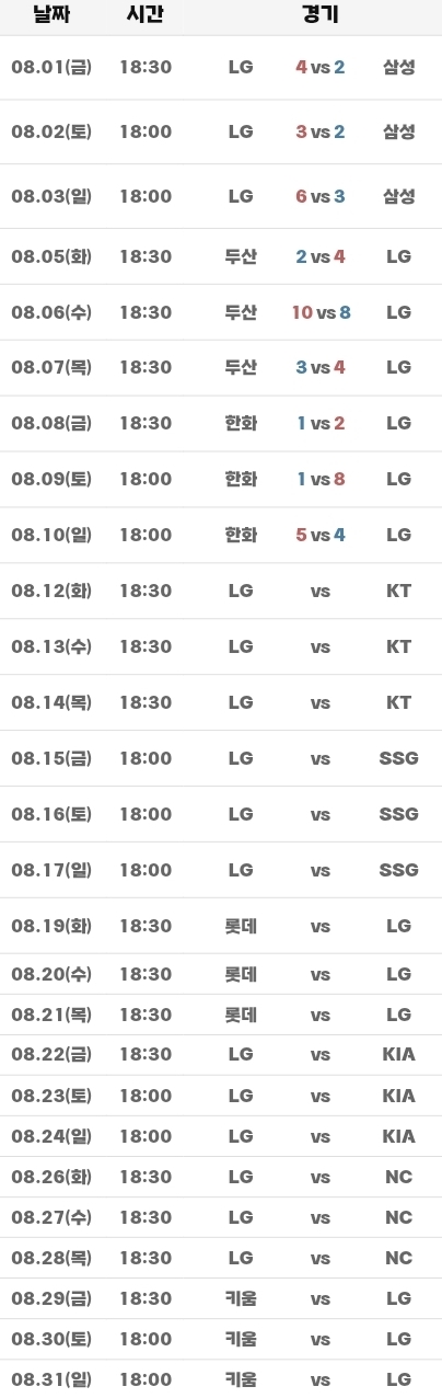 LG트윈스 8월 경기일정
