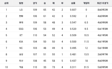 2025프로야구 정규시즌 현재구단순위