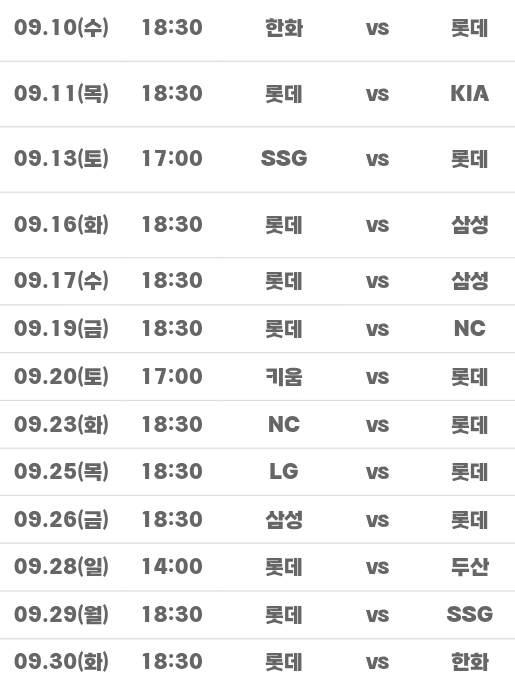롯데자이언츠의 9월 잔여경기일정표와